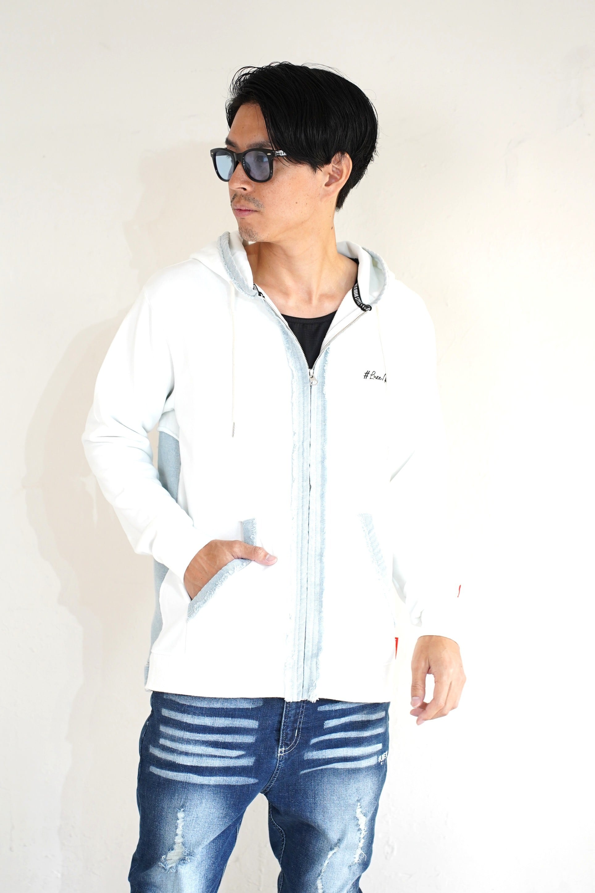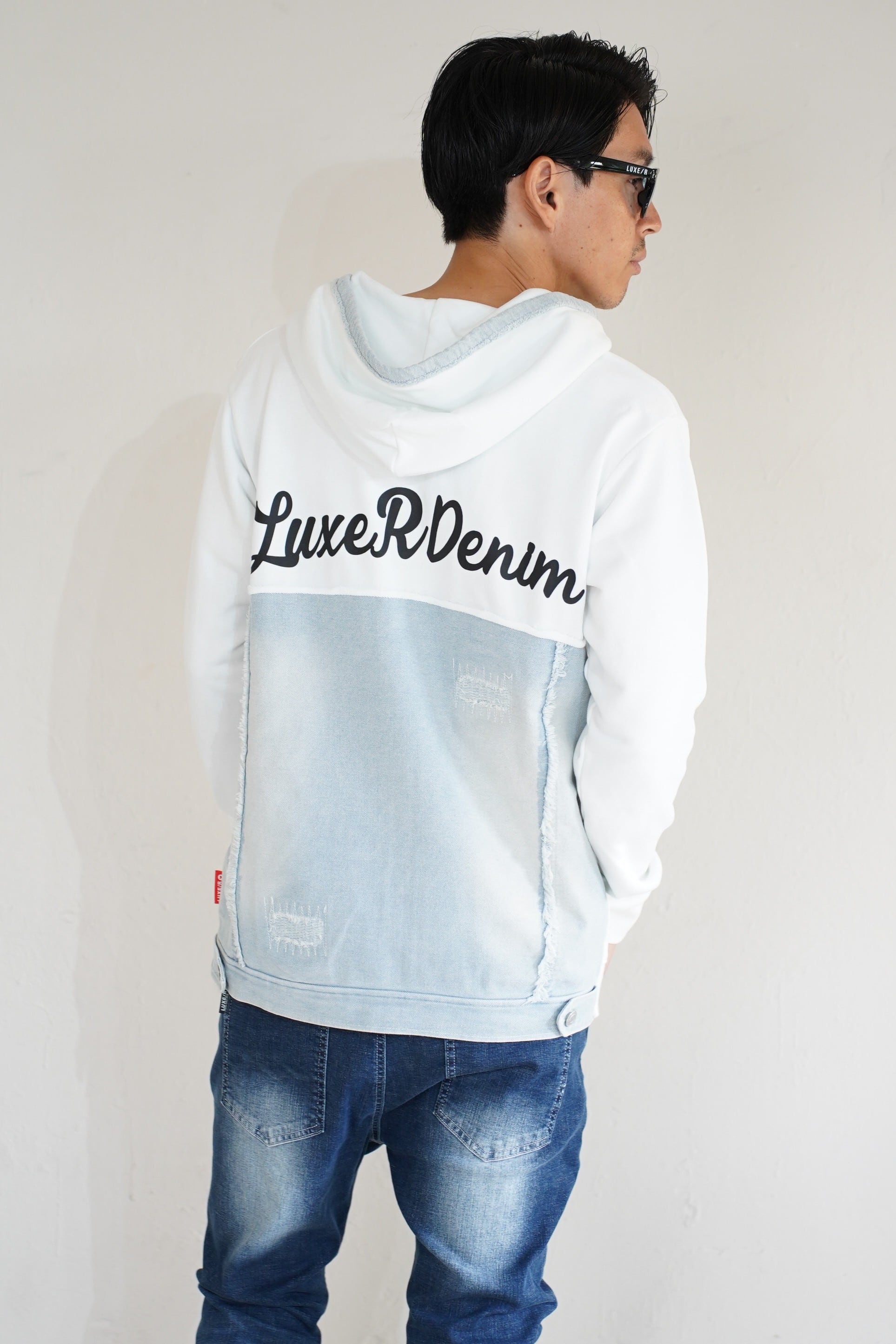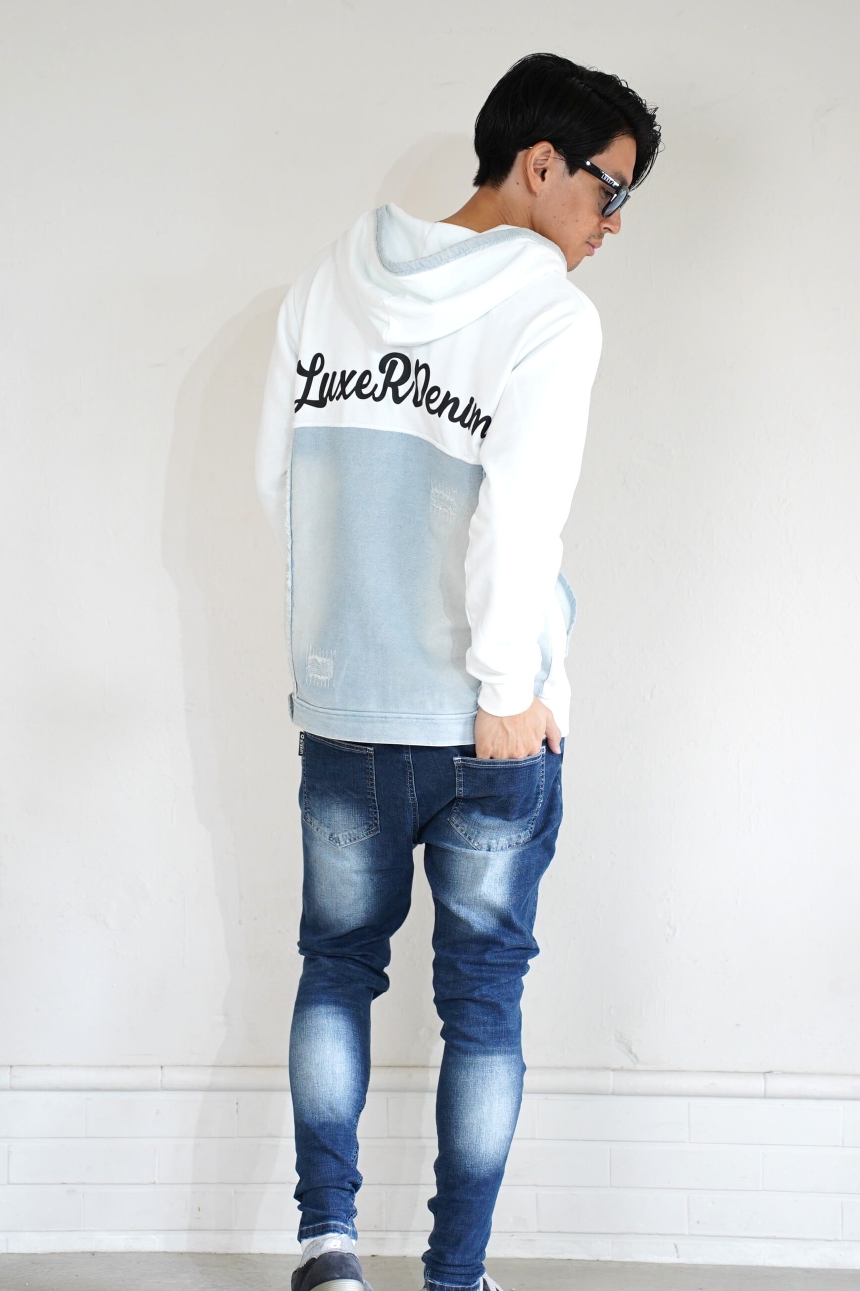 フロントにはデニムでロゴ切り替えカットを掛け合わせた新しいアイテムにしてます、ハイブランドのようにアレンジしました。