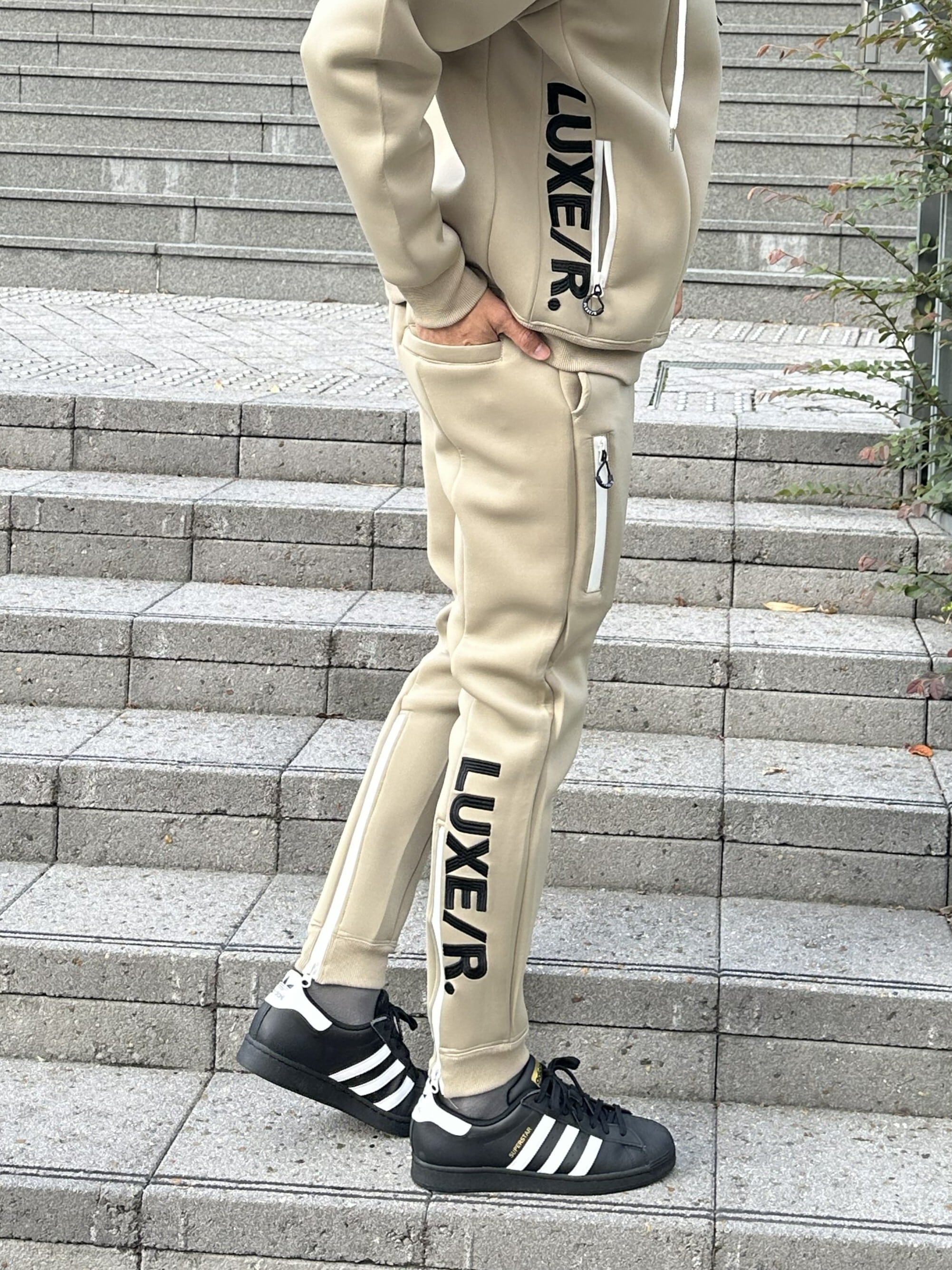 【暖かく】【ストレッチ性】に優れ、快適な着心地が魅力の【LUXE/R】(46127)ストレッチボンディングジャージ生地切り替えロングパンツ。ボンディング素材を使用し、体温をしっかりと保持しながら脱ぎ着しやすい止水ZIPを採用しています。これにより、雨や風から守られつつも、動きやすさを追求したデザインです。
