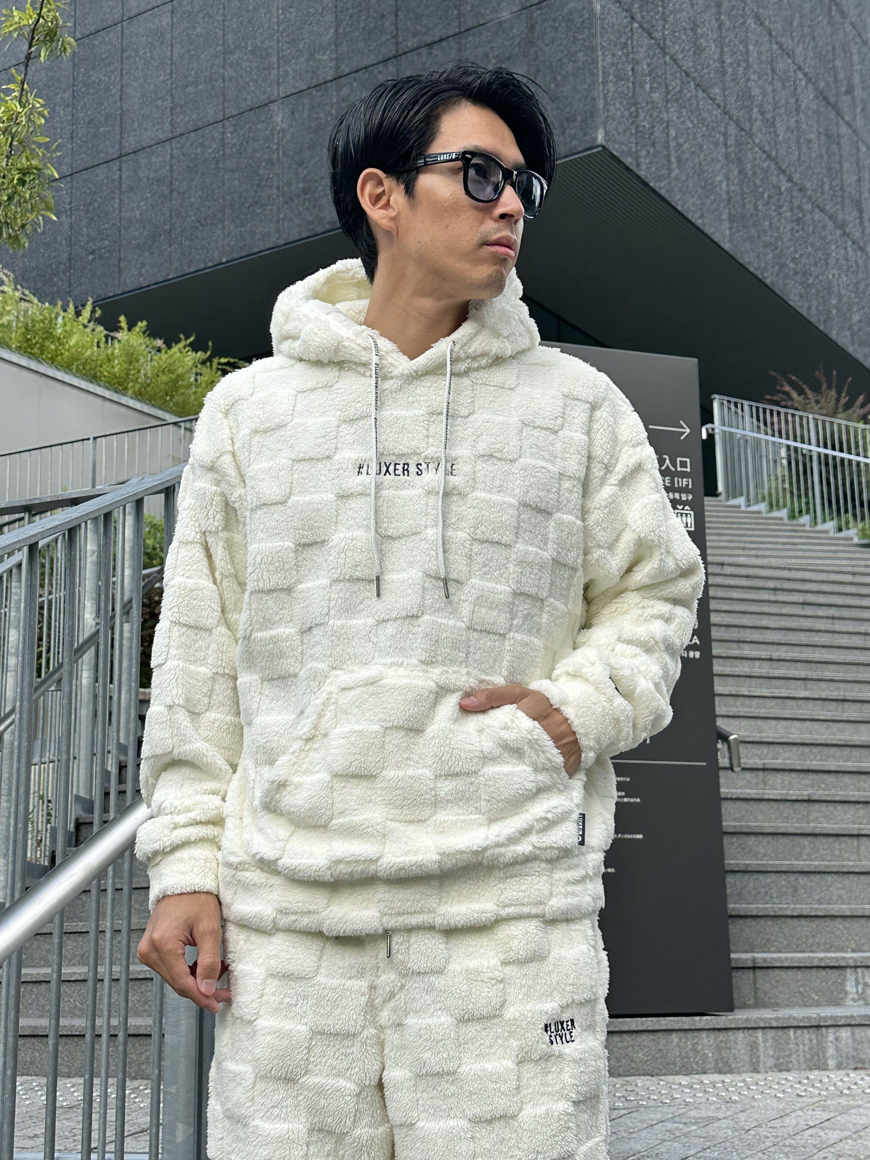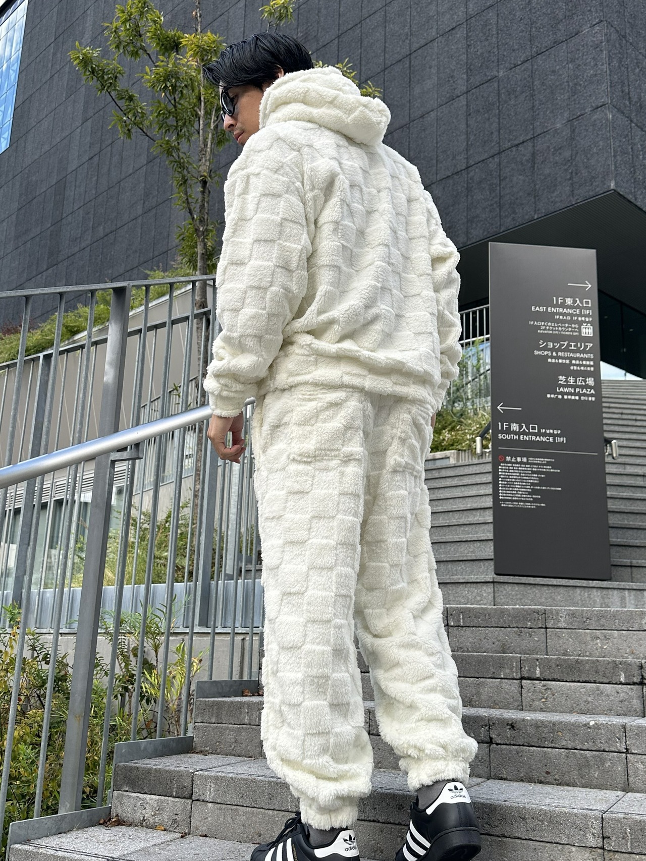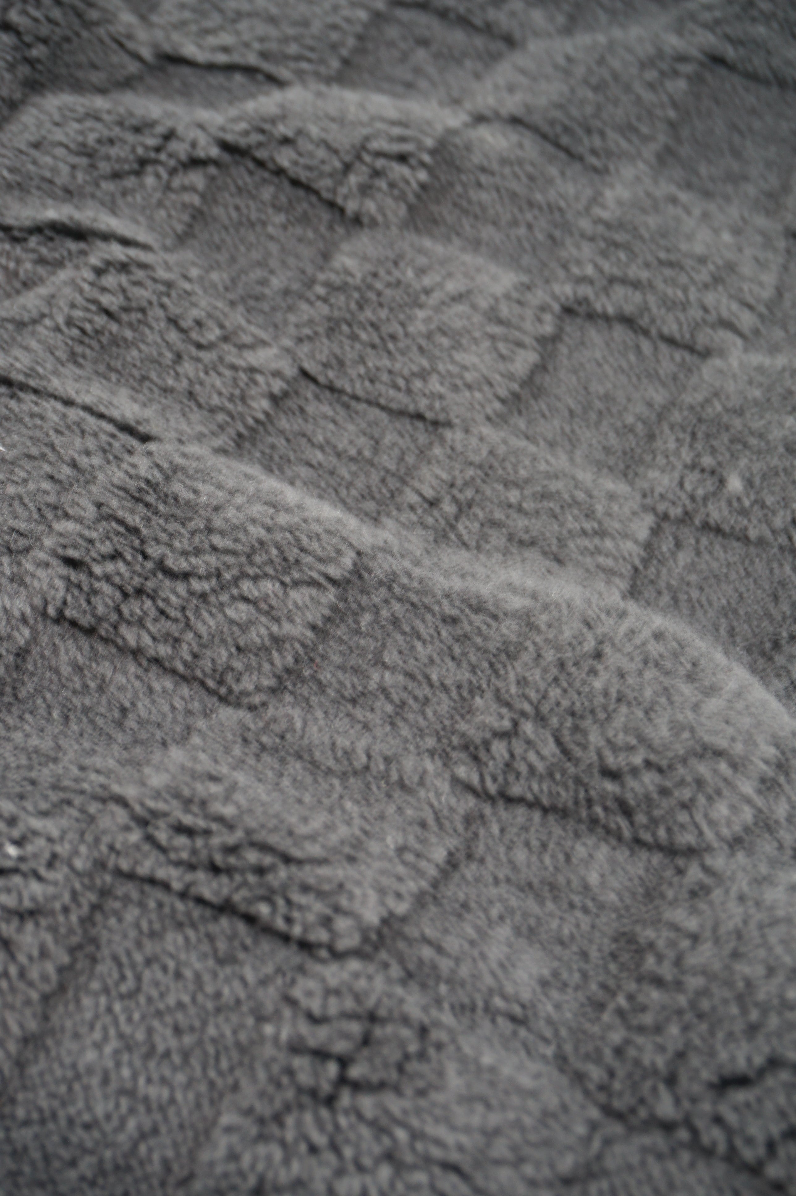 今回のブロックチェック柄フアーはとても柔らかく肌になじむ着心地の良い素材です。