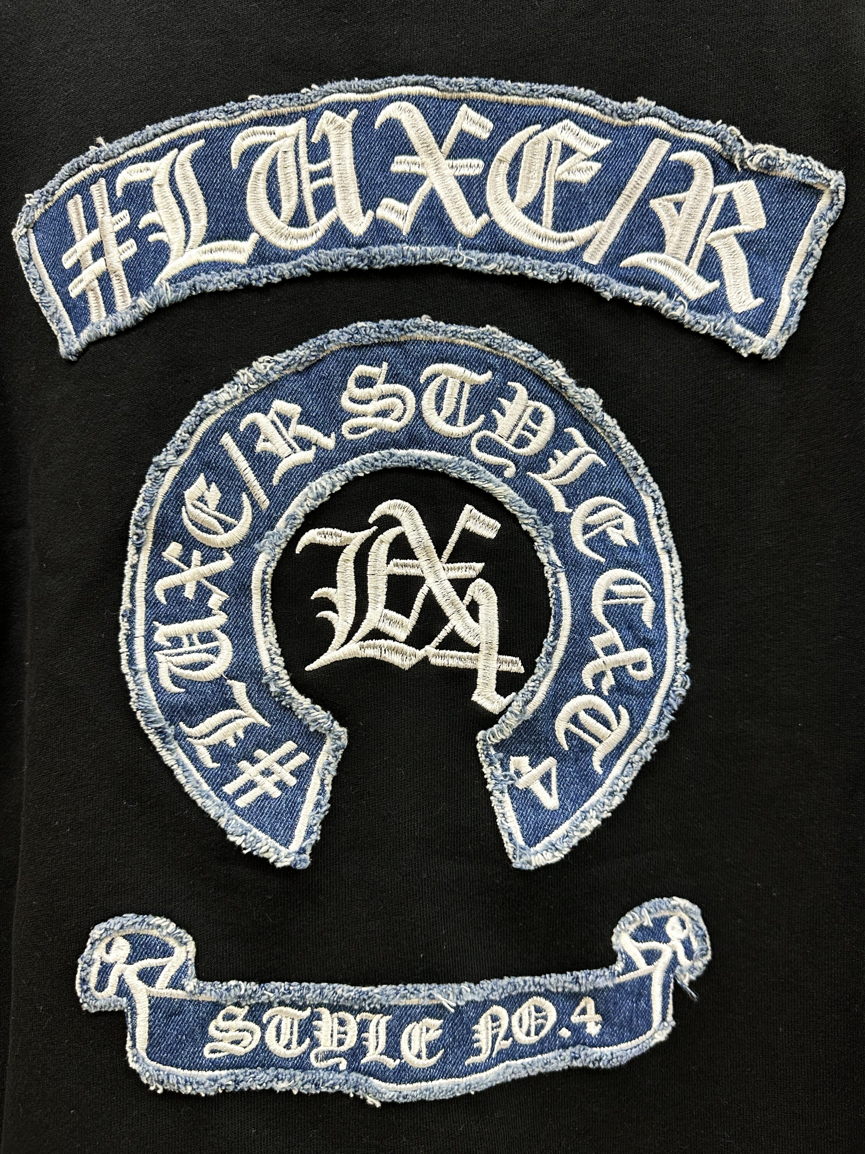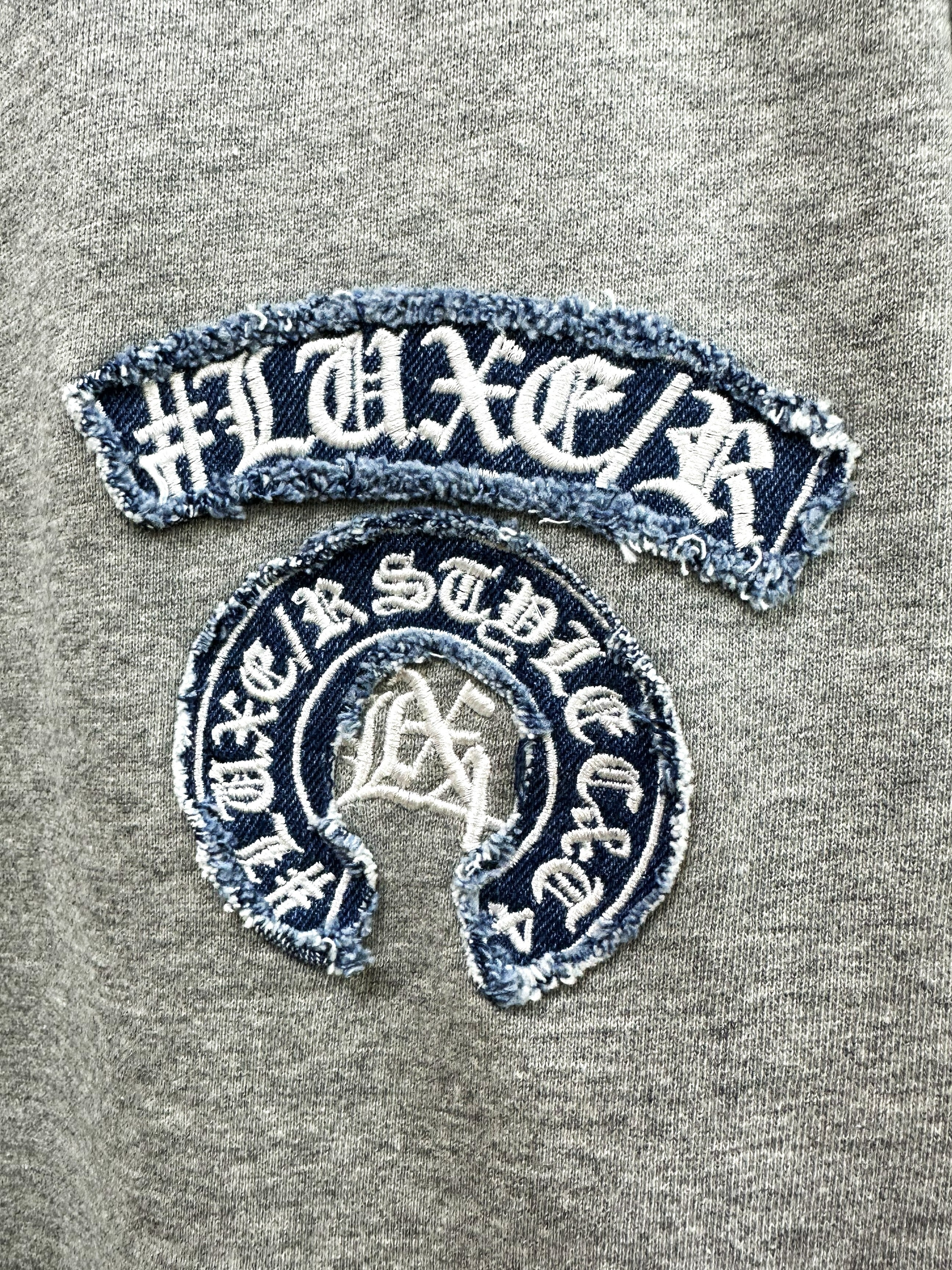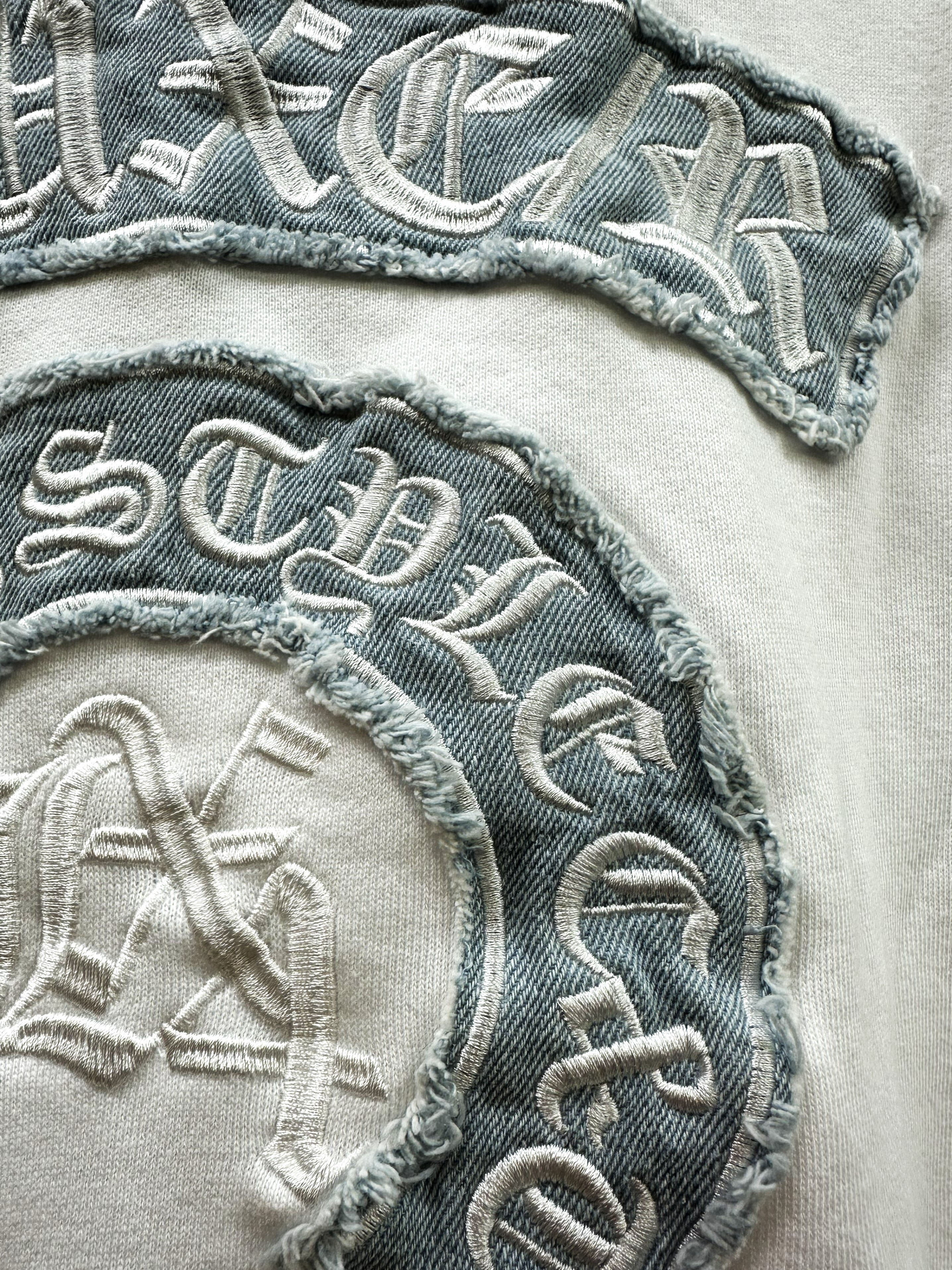 フロントにはデニム切り替え布帛ジャガードロゴ切り替えカットを掛け合わせた新しいアイテムにしてます、ハイブランドのようにアレンジしました。