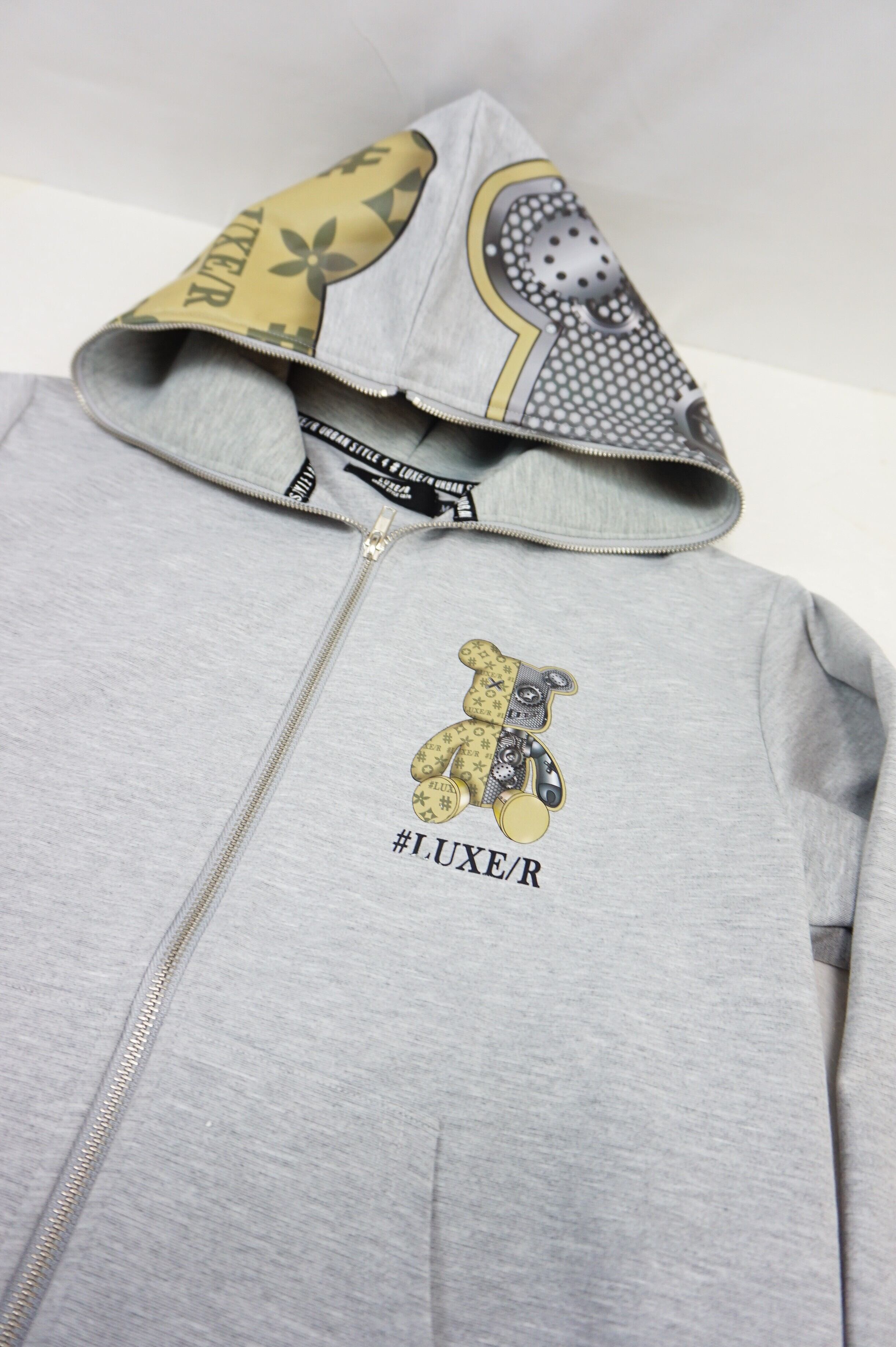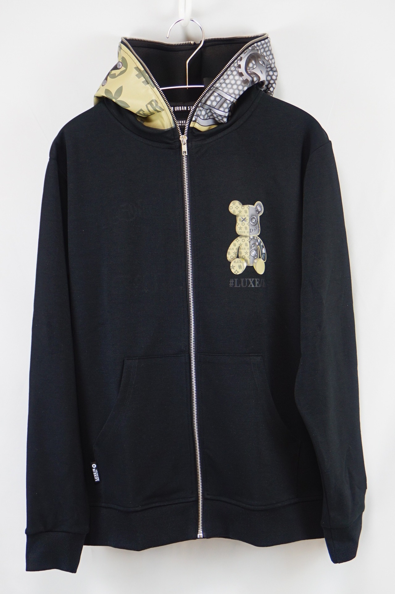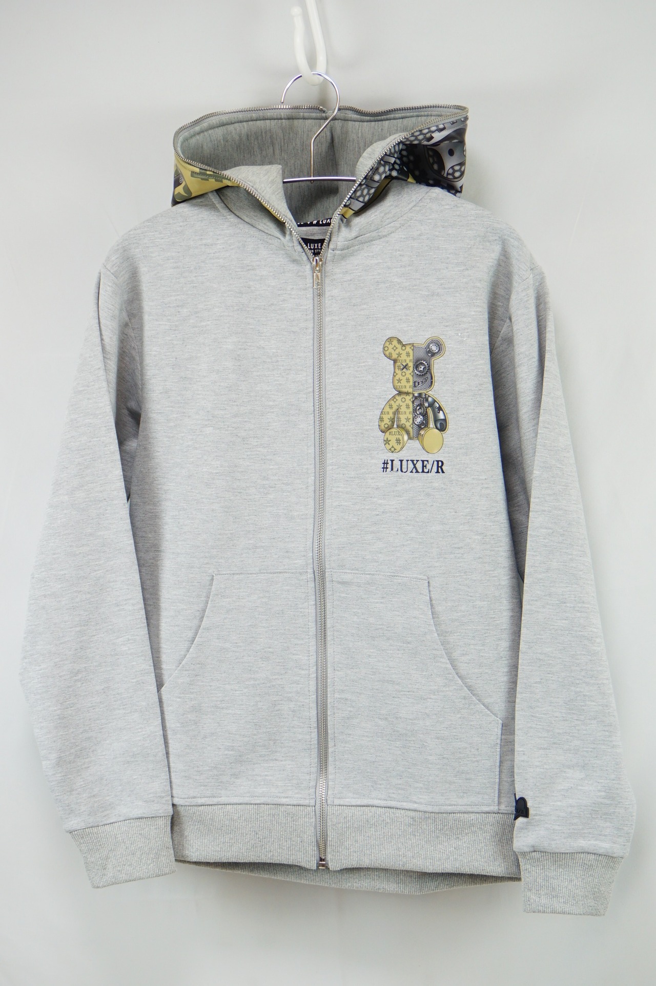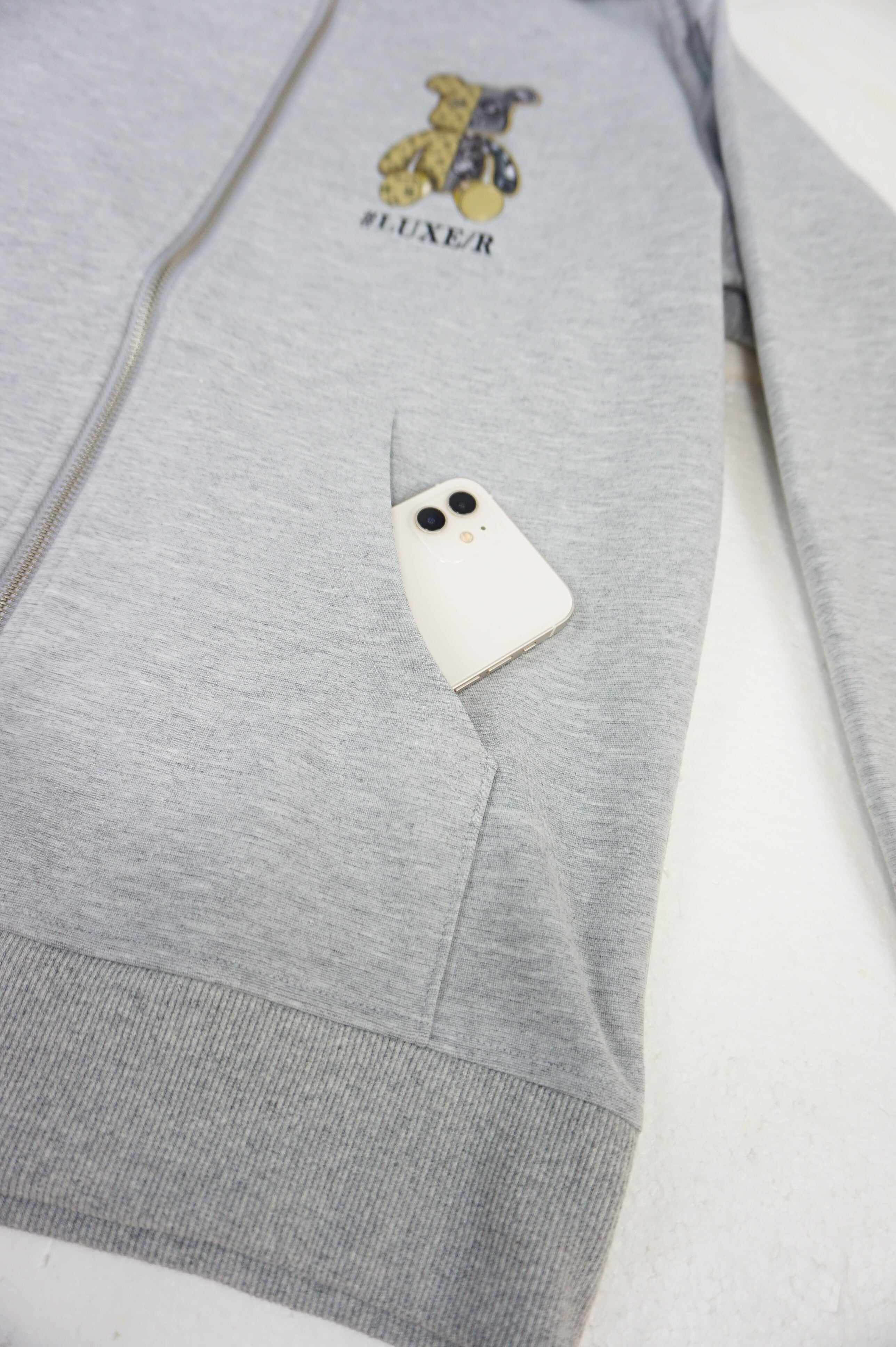 ポンチジャージ生地にベアー柄を転写プリント、新しいアイテムです、、ハイブランドでよく扱われる。転写プリントというフードにプリントして立体的になるような貼り付けという技法で大人可愛いスウェットにしました!シックでワンポイントが可愛いZIPUPパーカーです!やや細身な感じです!裏返してネットに入れて優しく洗濯して下さいね!