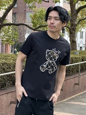 ベアー柄をジャガード布帛で切り抜き刺繡しました!新しいアイテムですハイブランドでよく扱われるベアー柄を、大人可愛いTシャツにしました!シックでワンポイントが可愛いTシャツです!やや細身な感じです!裏返してネットに入れて優しく洗濯して下さいね!