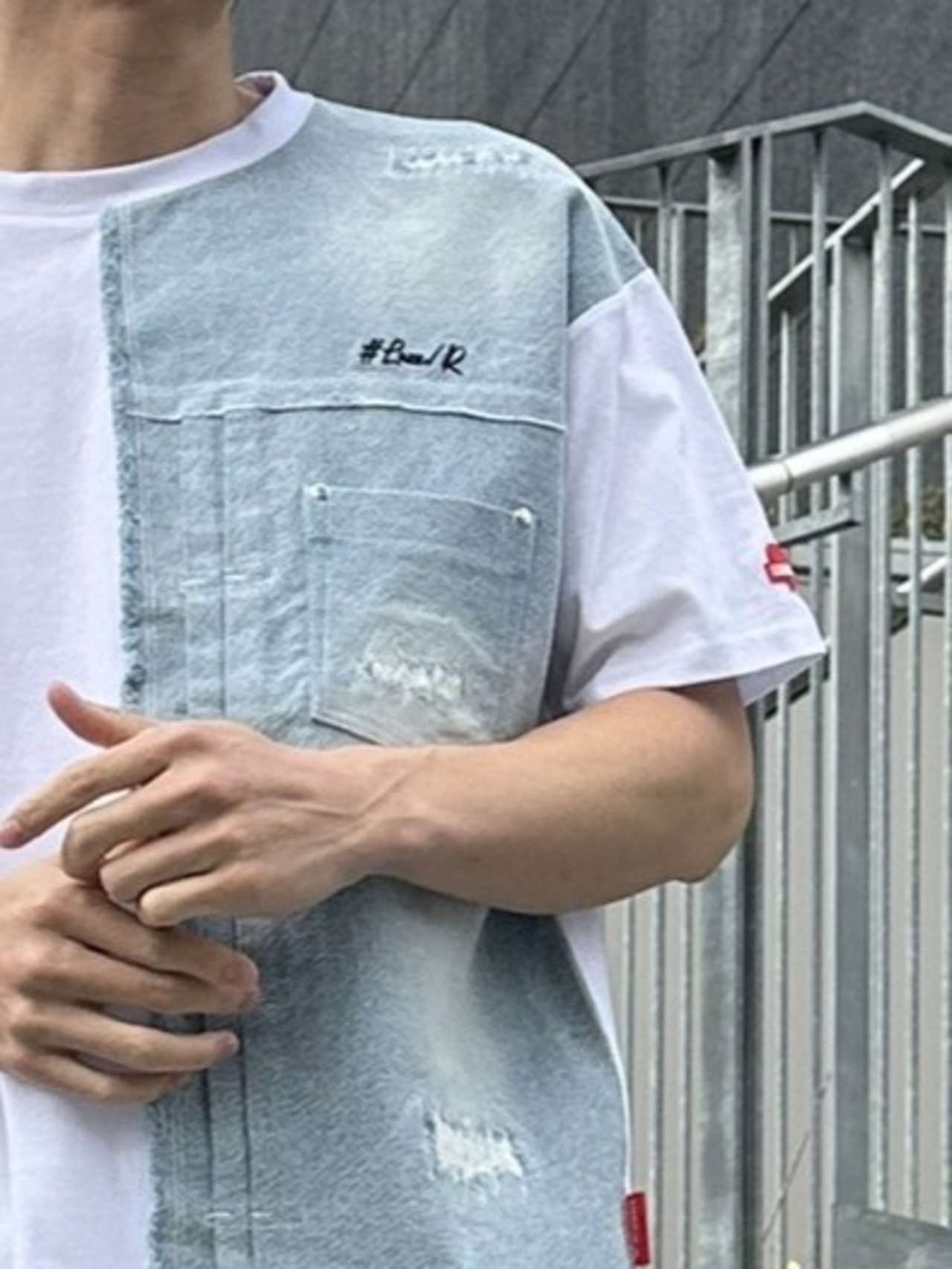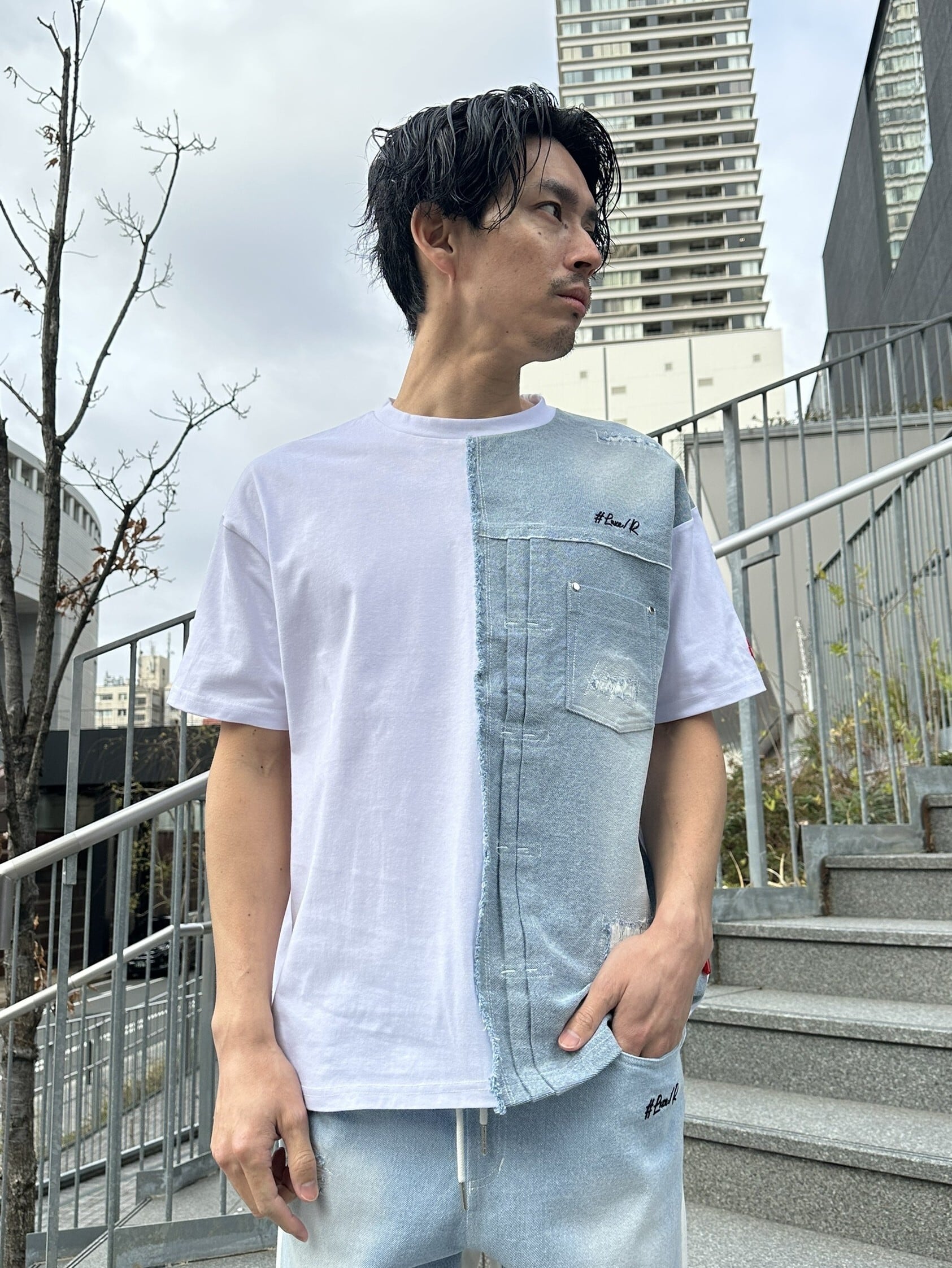 【LUXE/R】46279(ユニセックス商品)デニム切り替え天竺貼り付けTシャツ