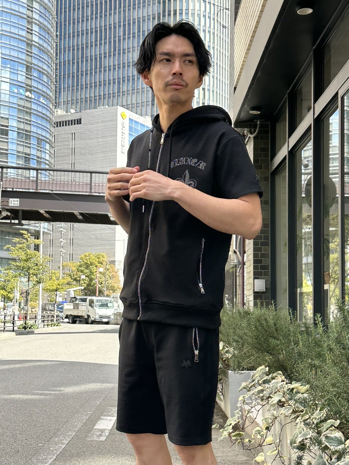 【LUXE/R】46275(ユニセックス商品)ポンチ生地サイドラインストーンZIPパーカ