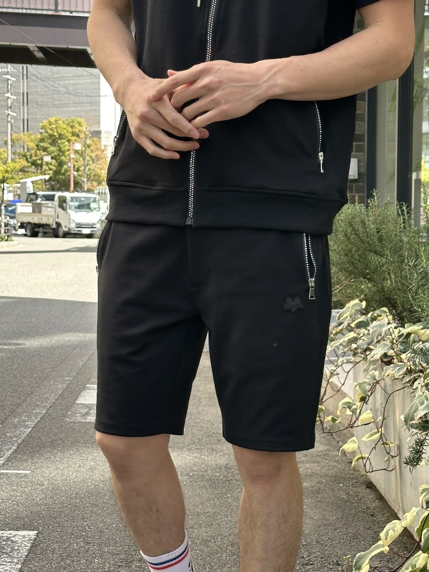 素材は中肉生地、収縮性がありソフトな肌感です!ユニセックス商品です、SET/UPでもご利用頂けます。サイドポケットはラインストーンZIPUPです!