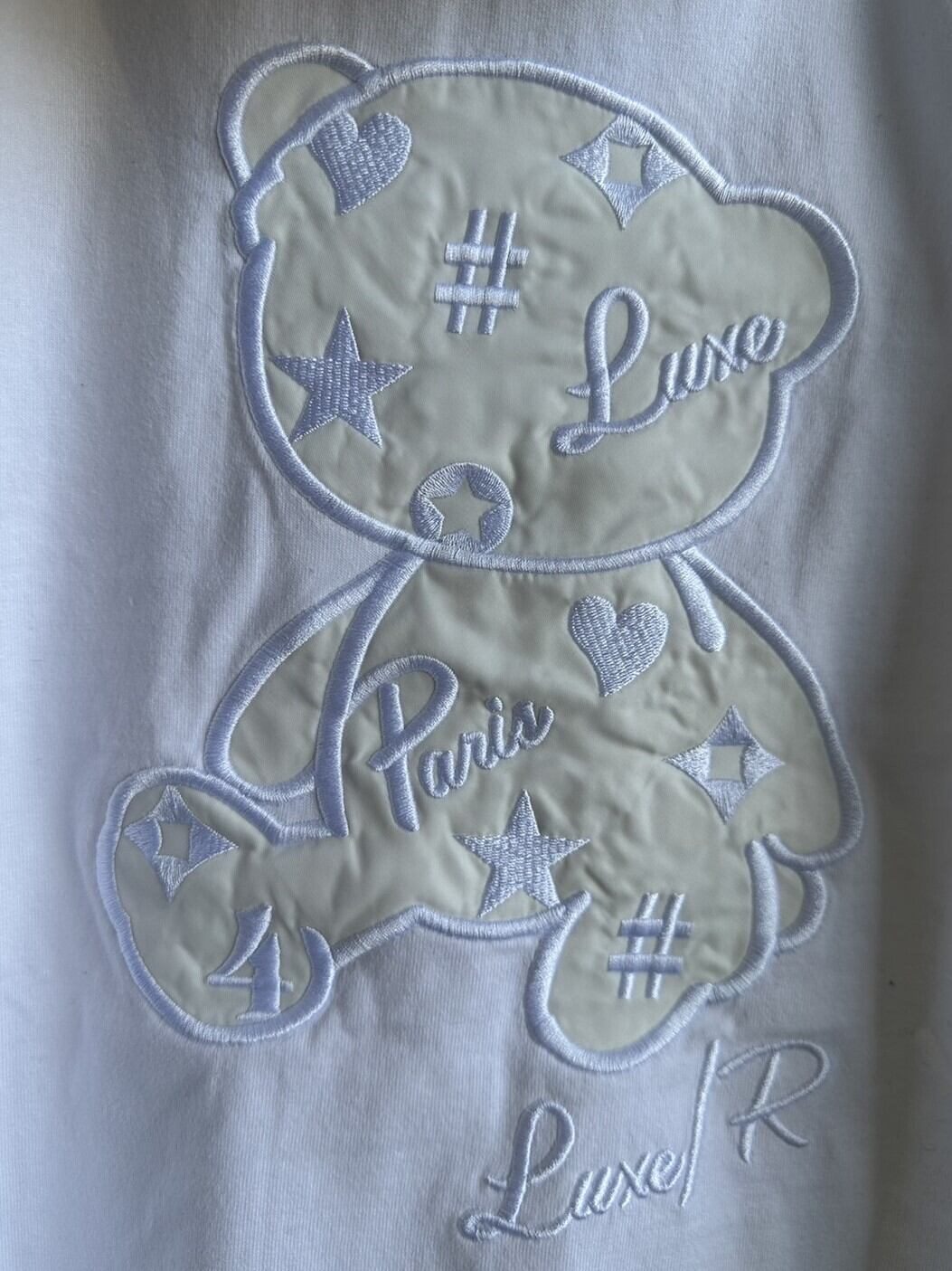 今流行りのBEAR柄をナイロン生地で型取りモノグラム調の刺繡を加えた、アートTシャツになります、海やリゾートなど色々楽しめる自由気ままにトラベルして下さい!シックでかわいい商品です!やや細身な感じです。SET/UPでもご利用頂けます。