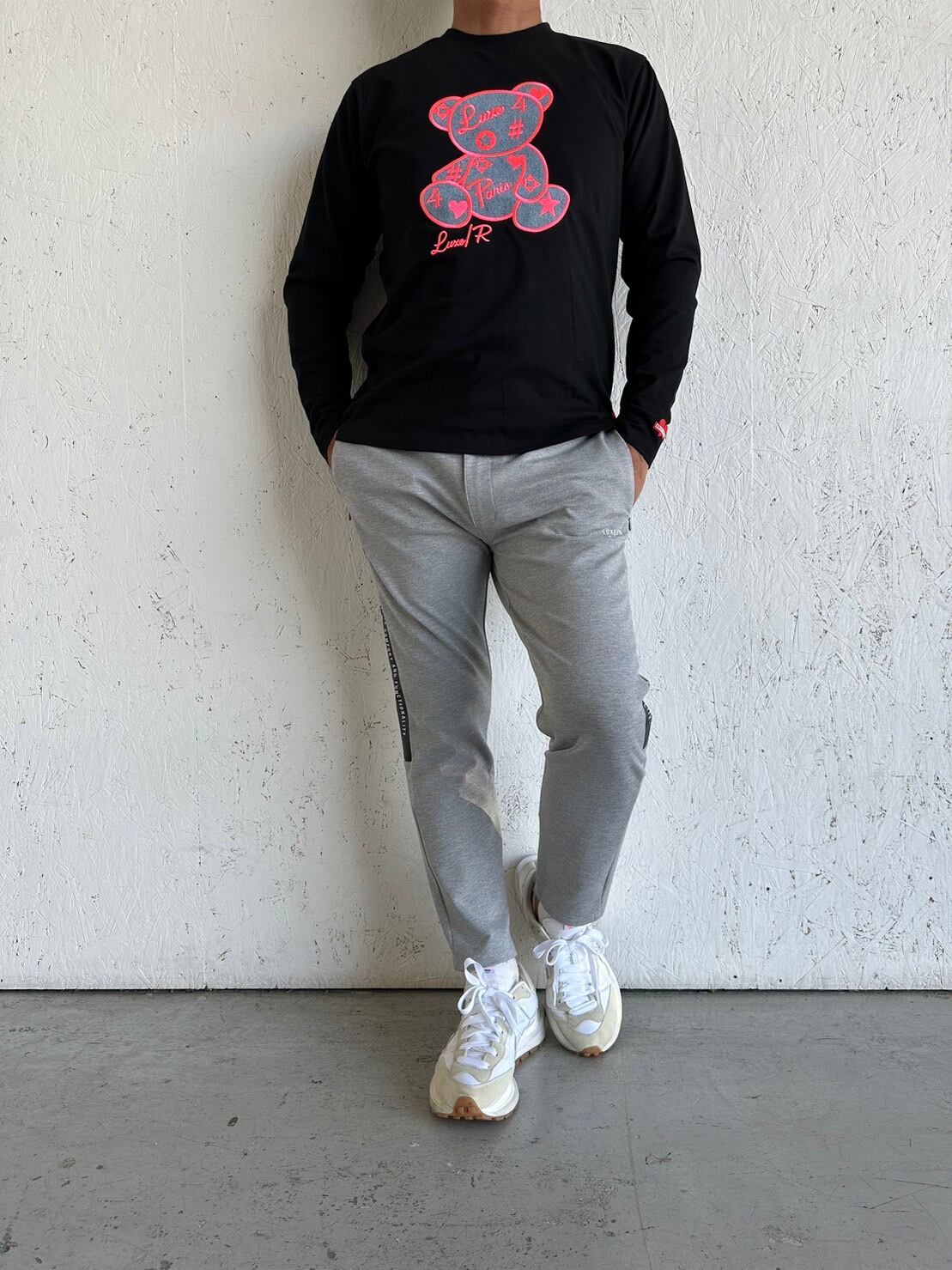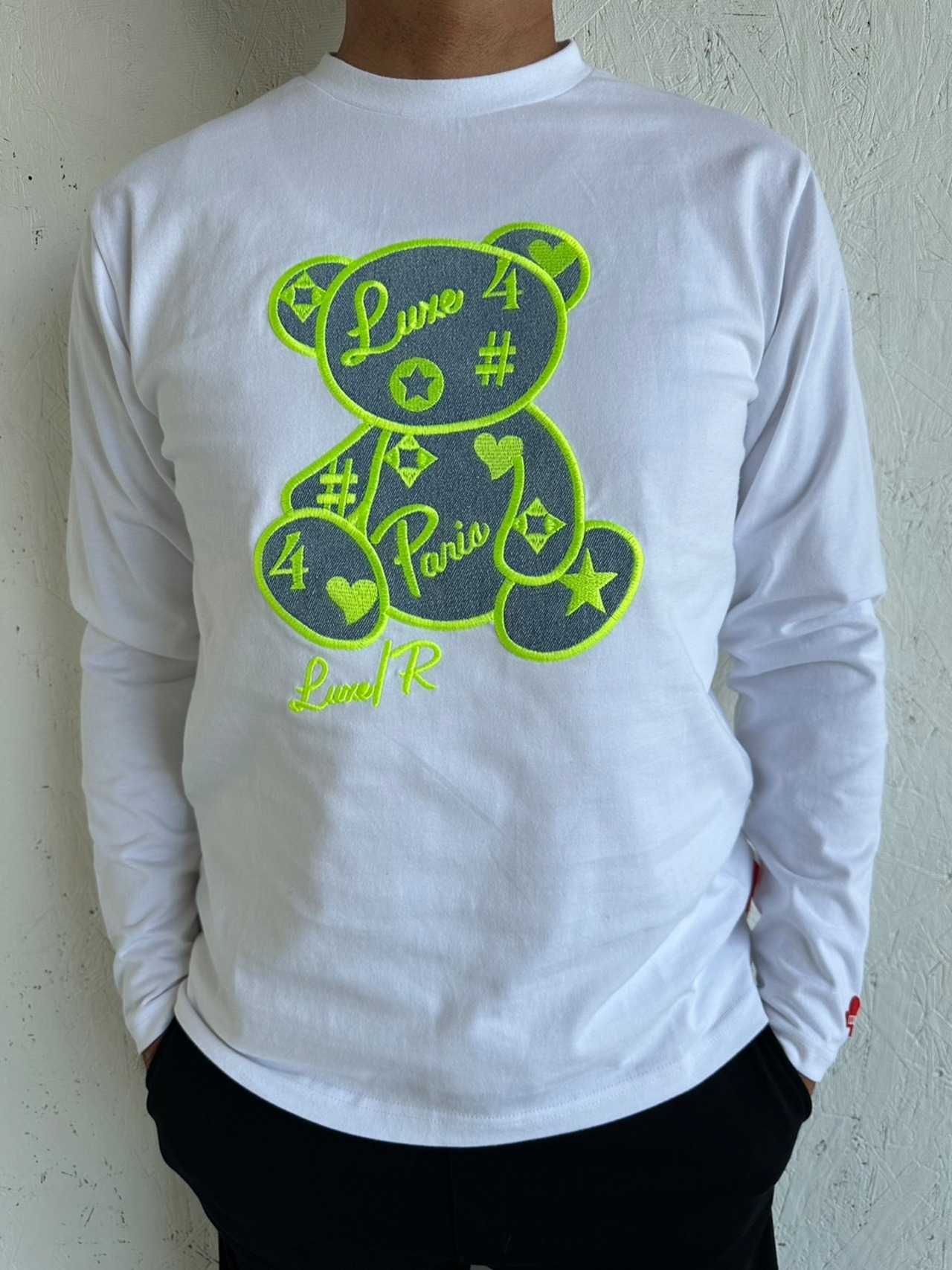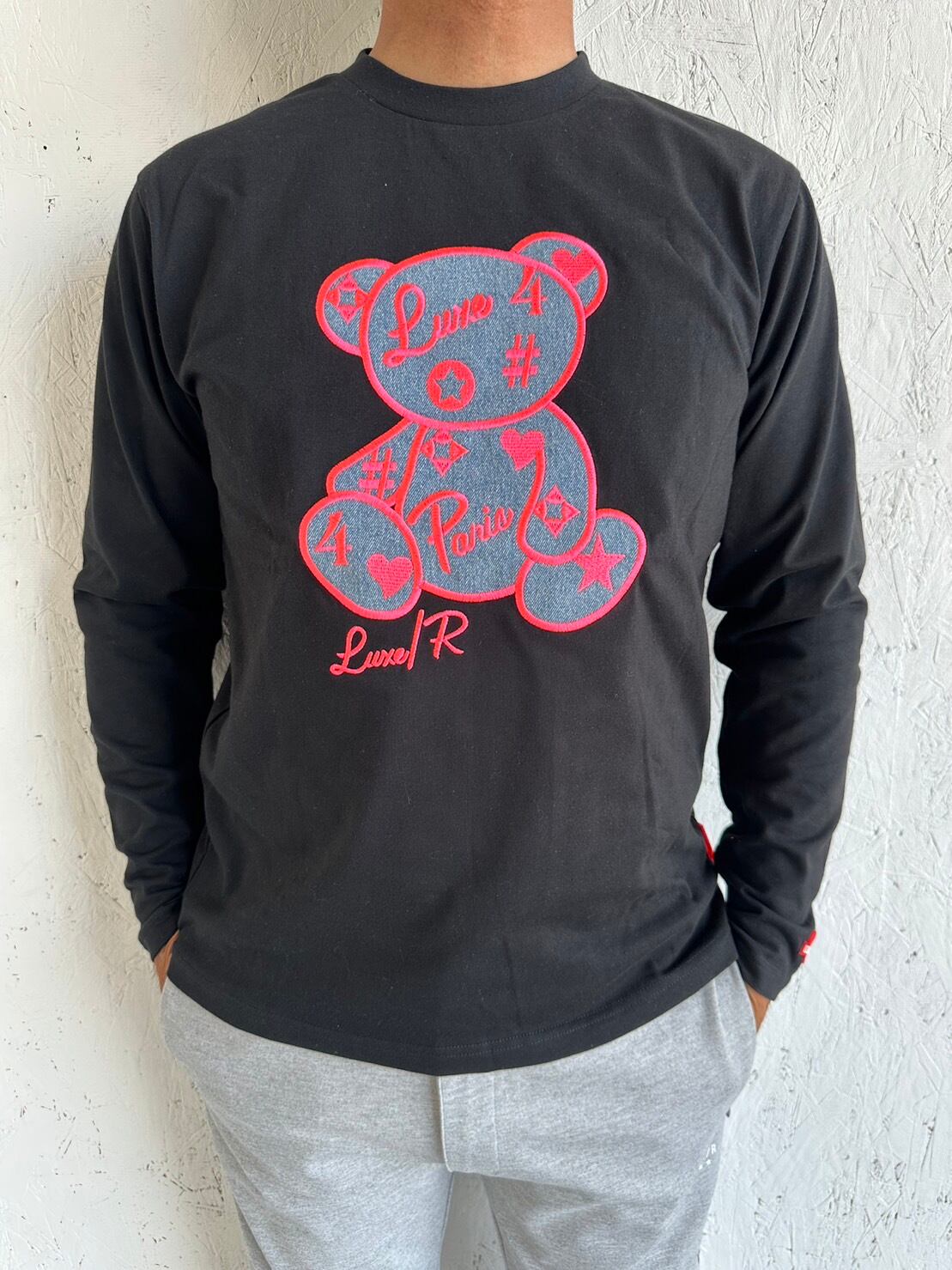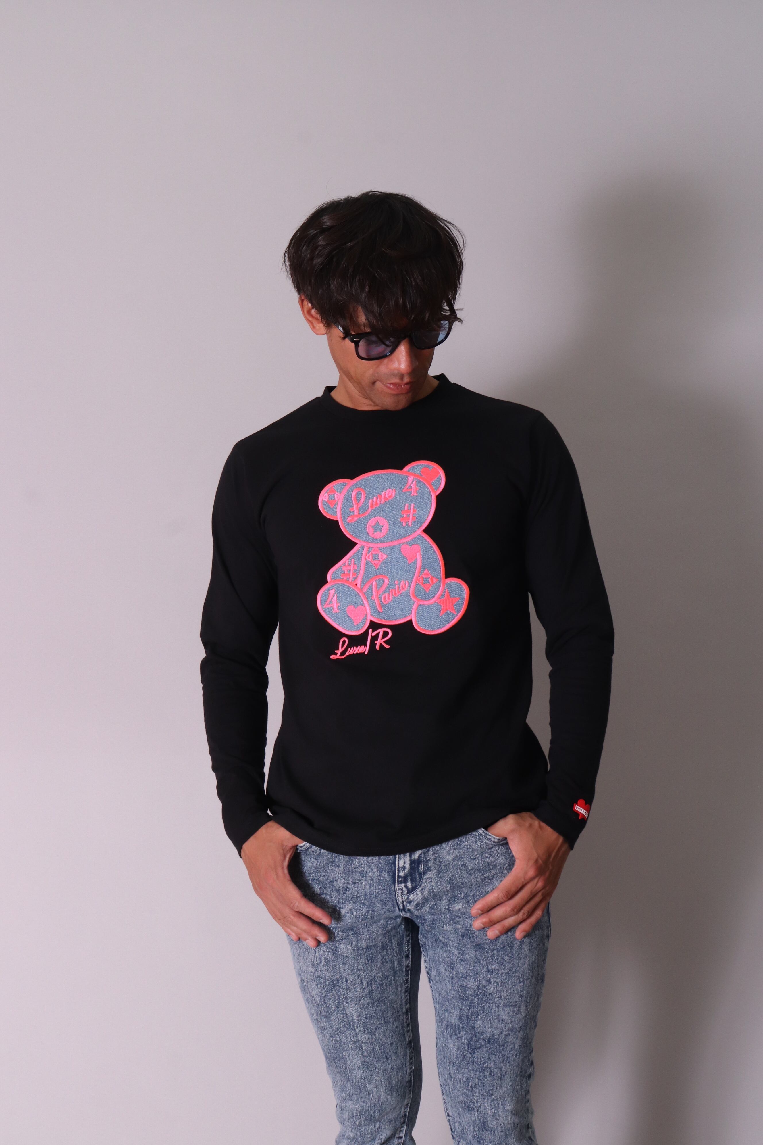 今流行りのBEAR柄、ハイブランドでよく扱われるクマ柄を、今回はデニム生地を貼り付けモノグラム調に蛍光刺繡した手間のかかるTシャツにしました!シックでかわいい商品です!やや細身な感じです。