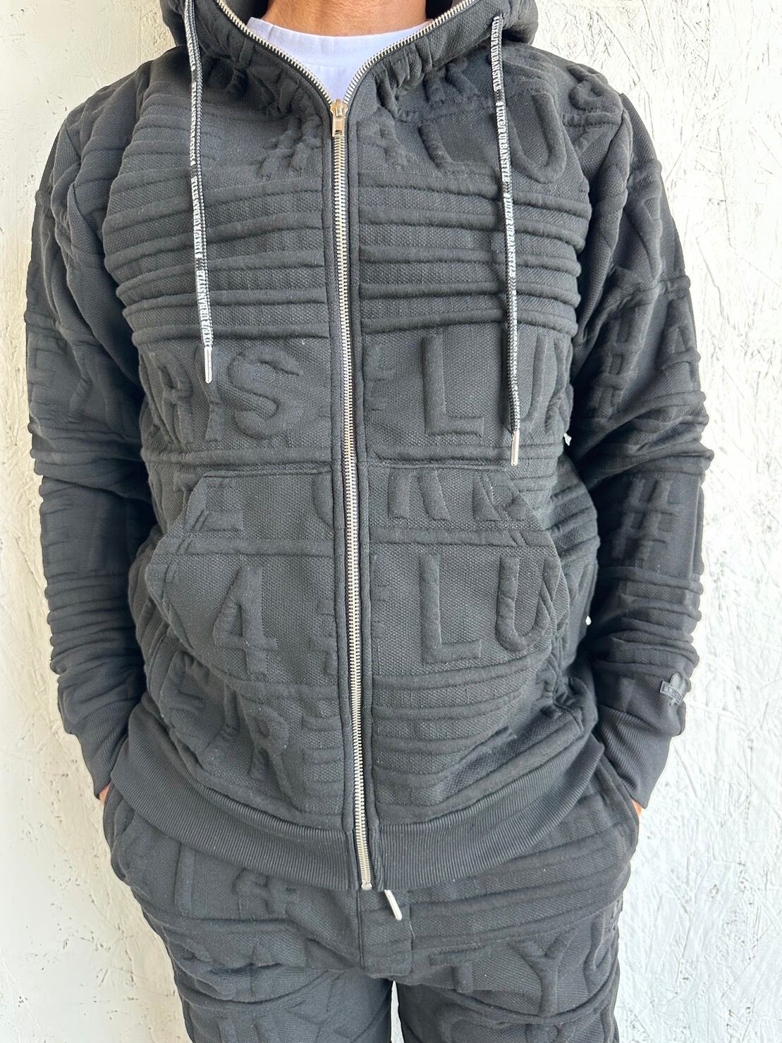 今流行りの膨れジャガード生地素材ジャージに似ている柔らかい柔軟な素材です!フード、袖、裾にはロゴジャガード織してあります、シックでスポーティな商品です。ジョギング、サッカー、ジムなどあらゆるスポーツに最適です。SET/UPでもご利用頂けます。
