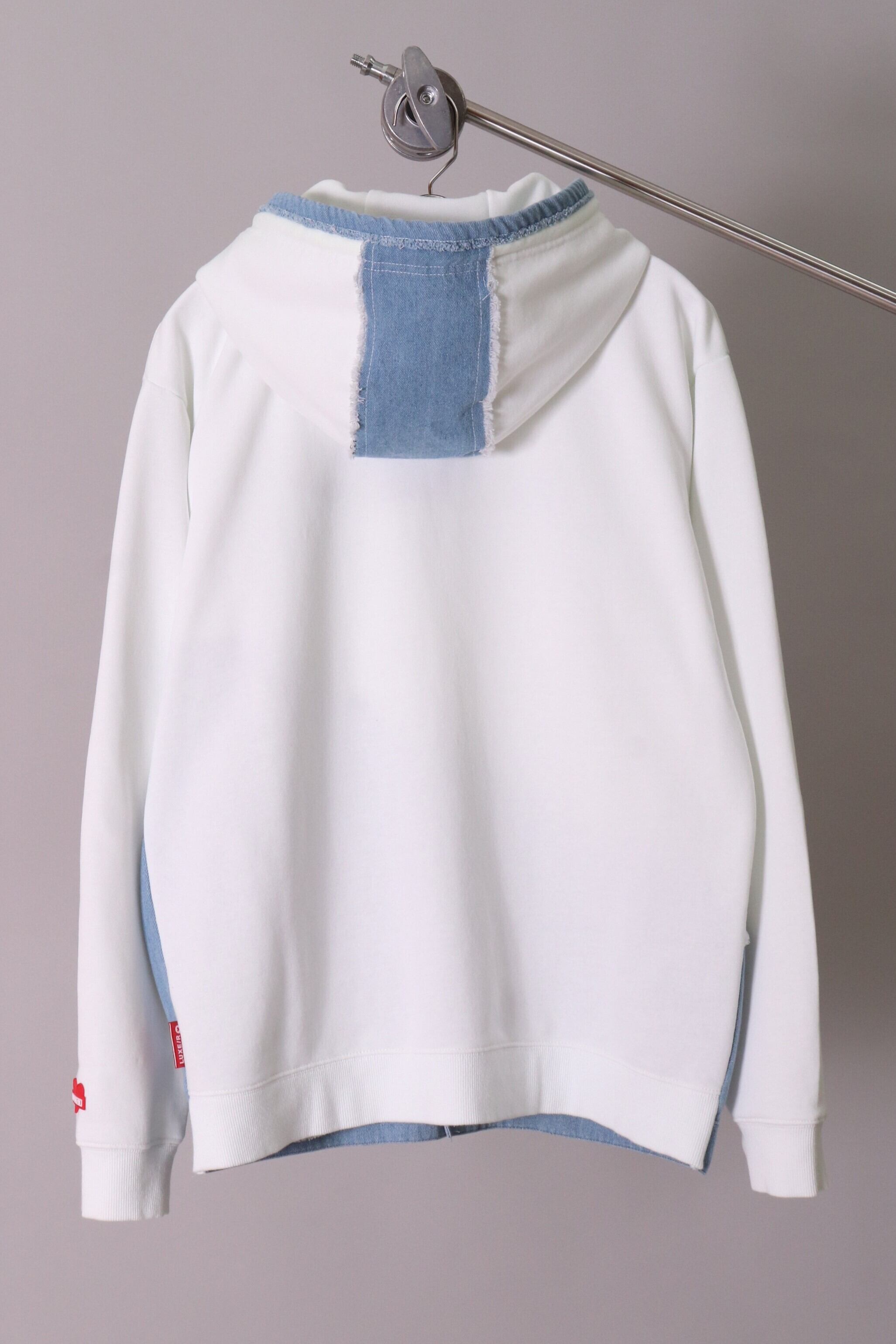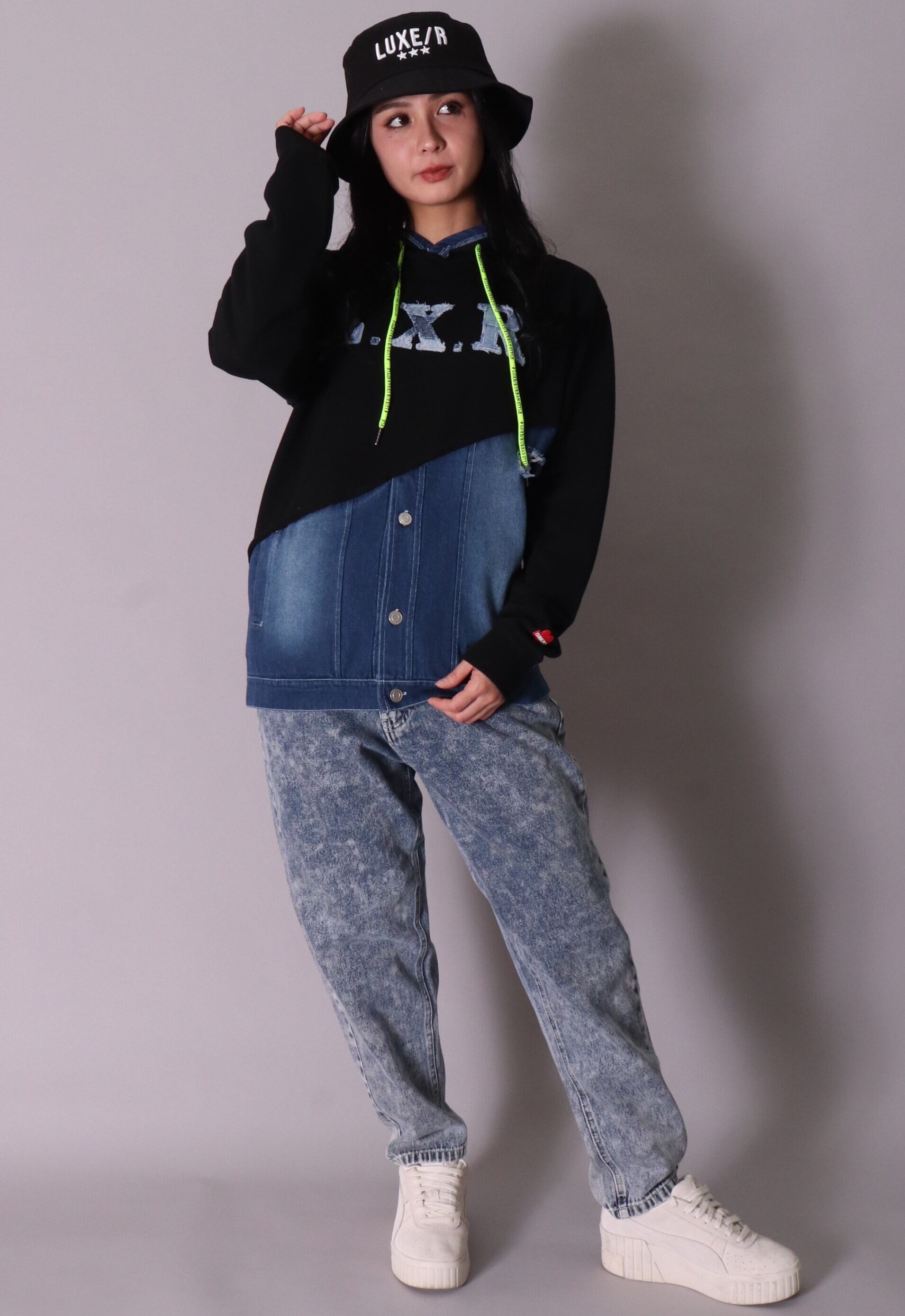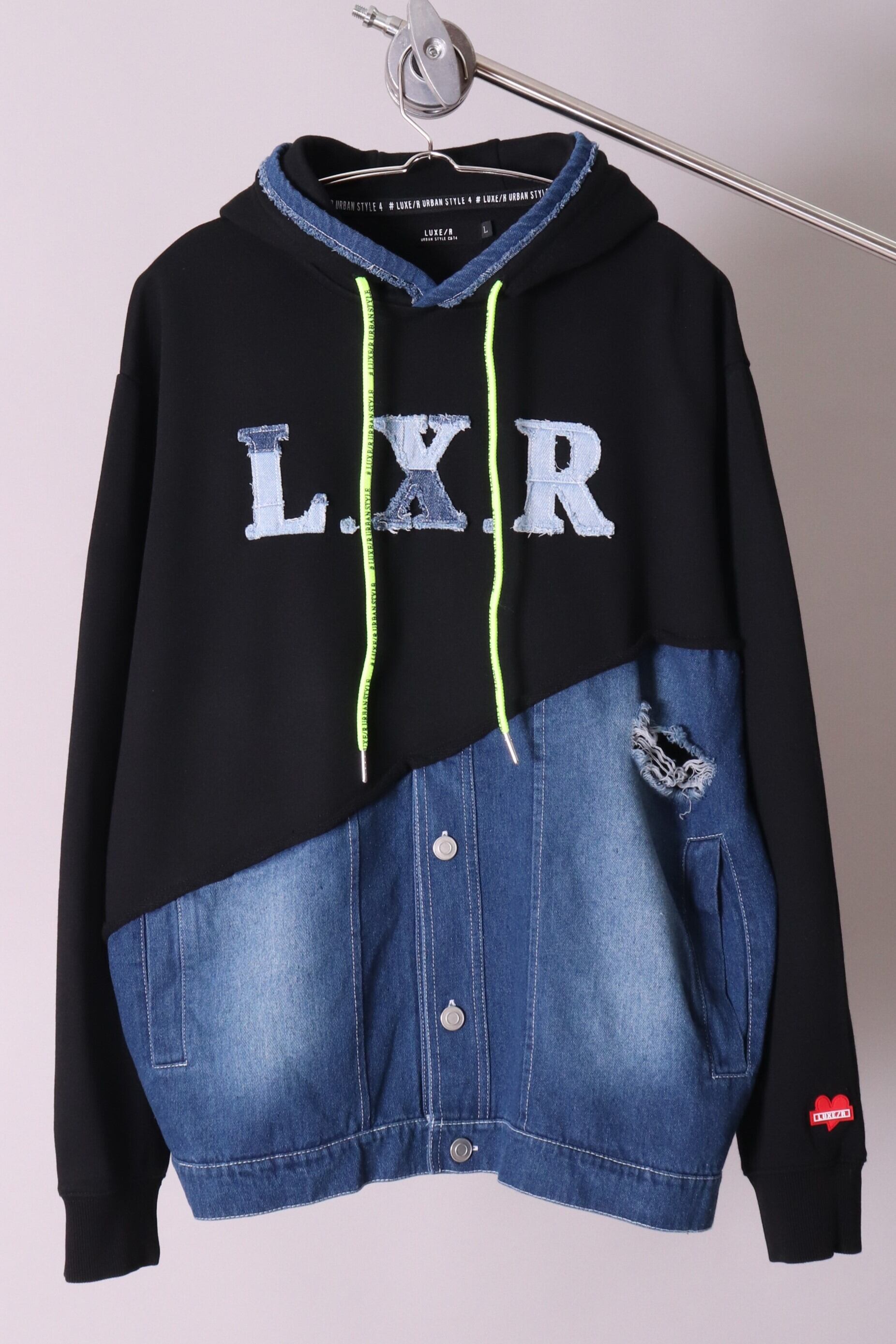 【LUXE/R(45557)デニム切り替え貼り付け裏毛スウェトプルパーカー