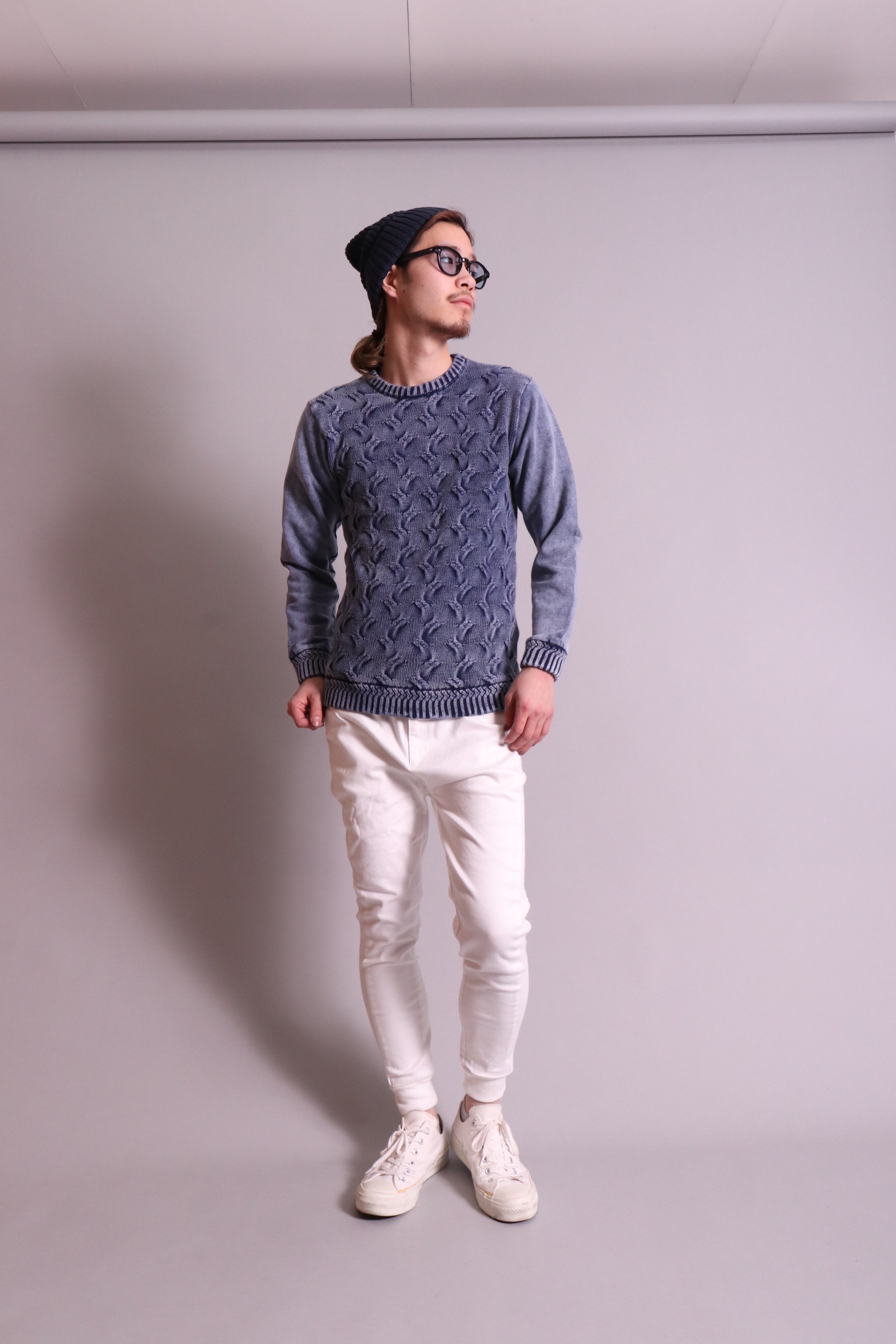 今年一押しのデニム素材をストーン加工してユーズド感を出しています、ジャガード編み生地事態に加工を施した時間のかかる商品です!
