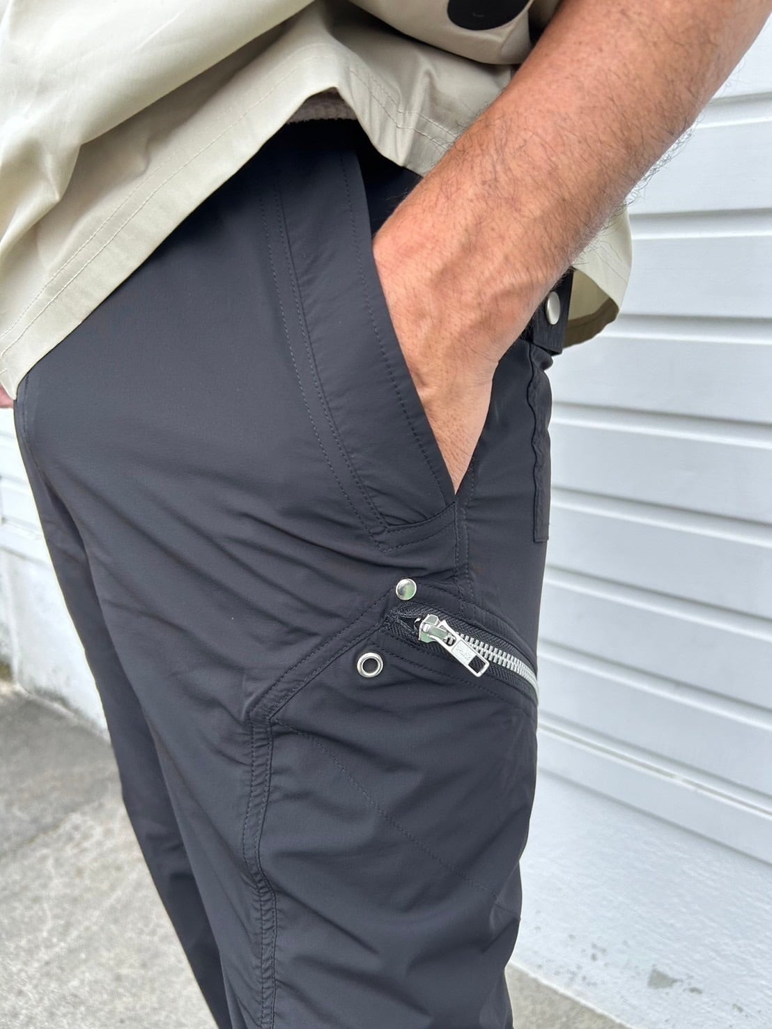 ●デザイン ⇒ ジップファスナー前開き/ウエストはゴム&紐のイージー仕様/ベルトループ有り/サイドポケットZIPUP