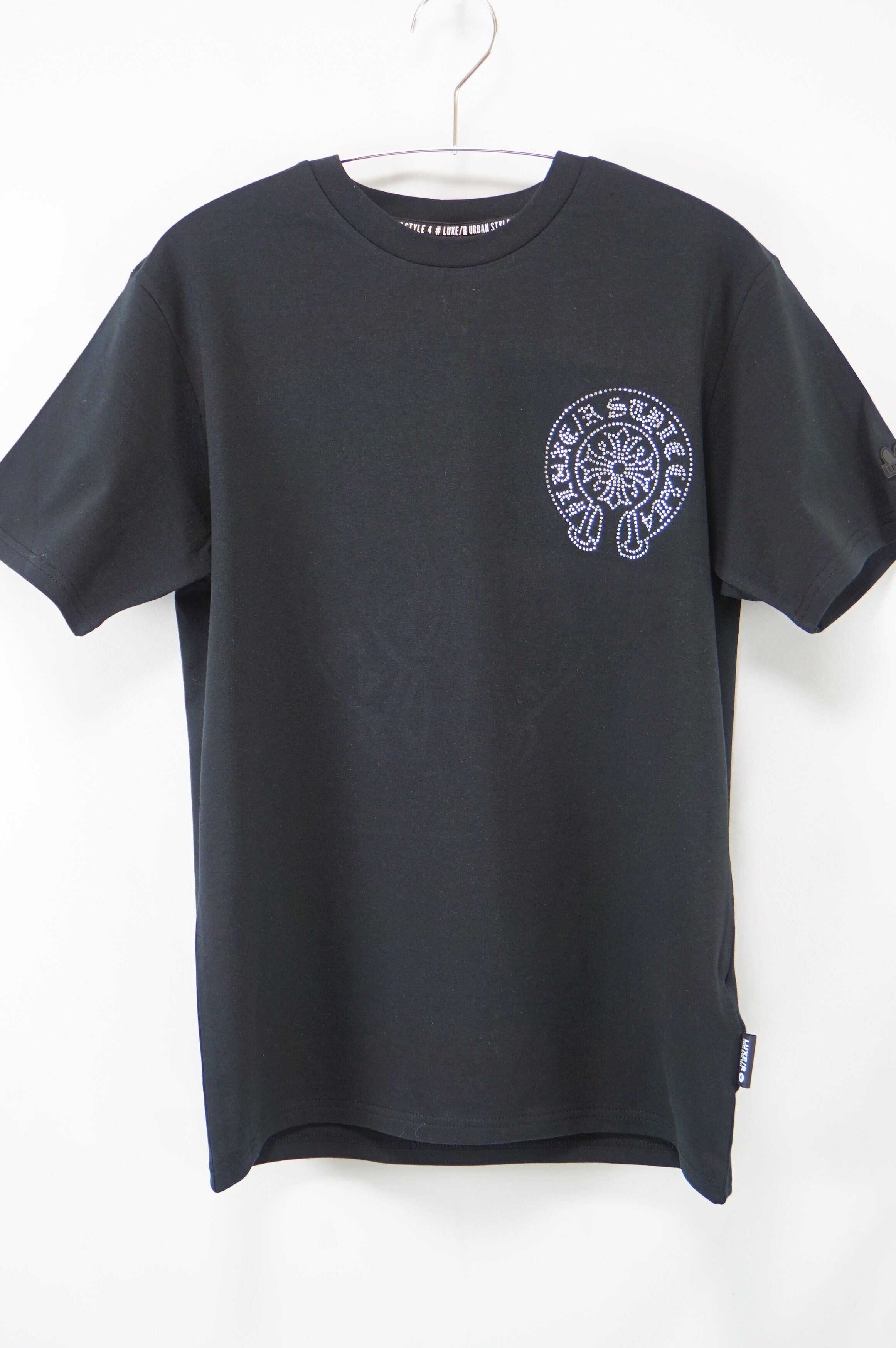 フオースシュー型をラインストーン貼り付けた新しいアイテムです、、ハイブランドでよく扱われるベアー柄を、今回はラインストーンで貼り付けという技法で大人可愛いTシャツにしました!シックでワンポイントが可愛いTシャツです!やや細身な感じです!裏返してネットに入れて優しく洗濯して下さいね!