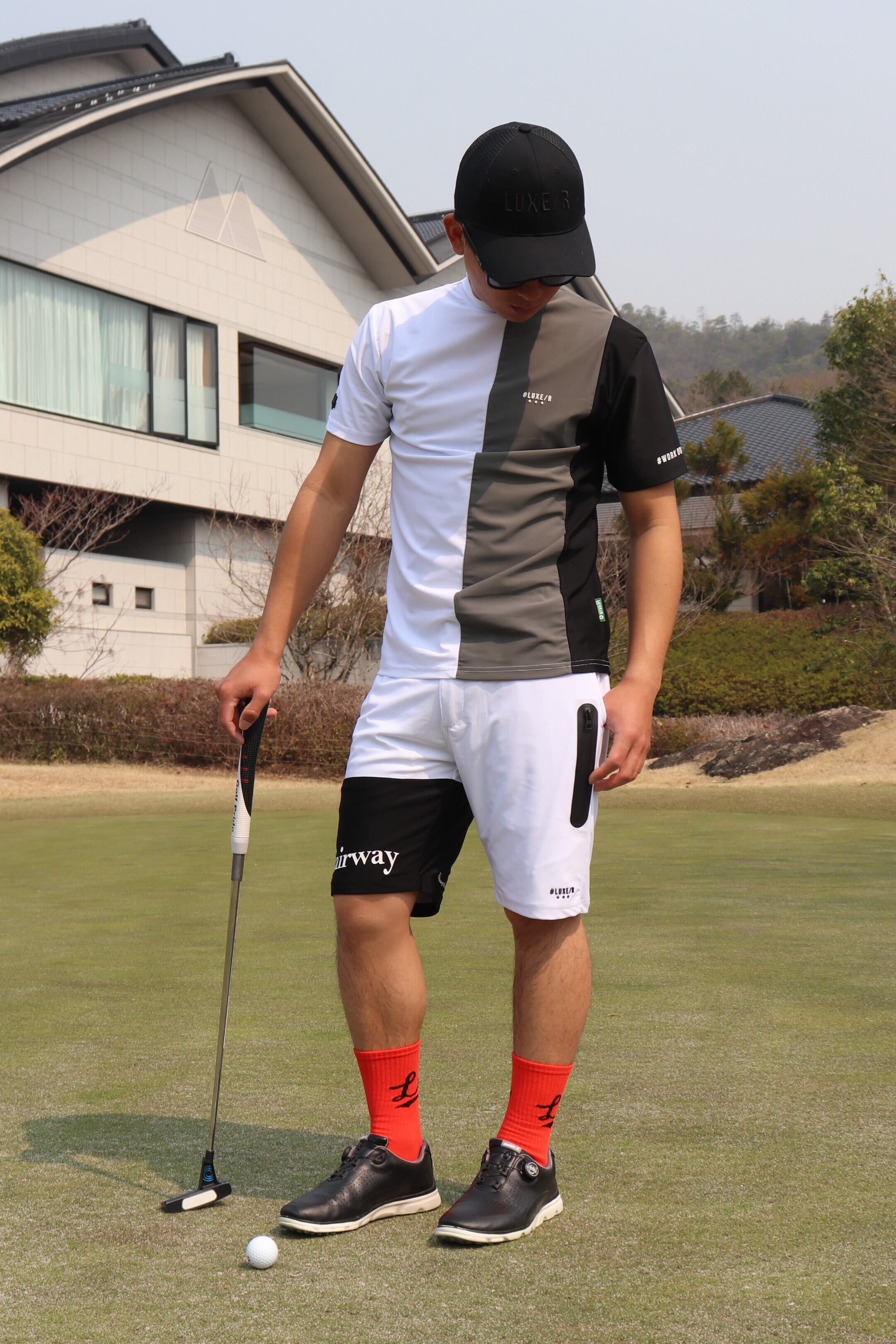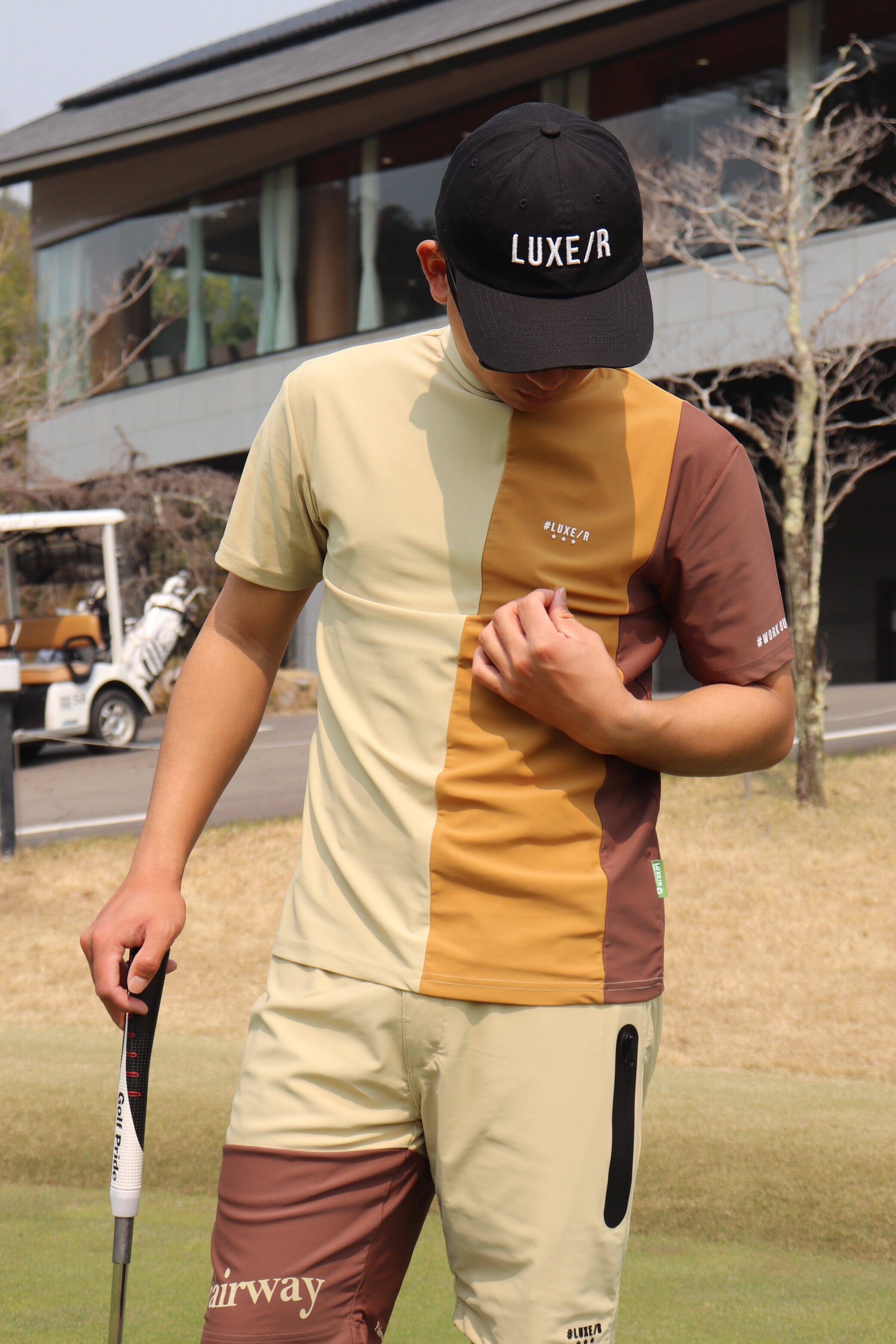 GOLFにも着用頂けます。LUXERな素材感にあっさりバックプリントでセレブ感満載ですね!今流行りのデザインです。